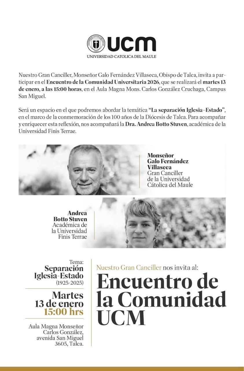 El pasado 14 de enero, nuestra profesora, la Dra. Andrea Botto, fue invitada a la Universidad Católica del Maule a exponer sobre la separación entre la Iglesia y el Estado desde la perspectiva de los agentes católicos y la sociedad de la época. En su intervención, la profesora Botto abordó el proceso histórico que culminó con la separación formal entre Iglesia y Estado en la Constitución de 1925, destacando la complejidad del debate ideológico, político y social que se vivió en Chile durante ese período.